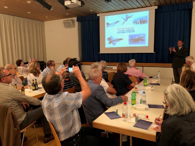 Nach einer Einführung durch Kantons- und Gemeinderat Christian Lucek informierte der Projektleiter der Luftwaffe, Oberst im Generalstab Peter Merz über das 8 Milliarden schwere Beschaffungsvorhaben zum Schutz des Schweizerischen Luftraumes.
